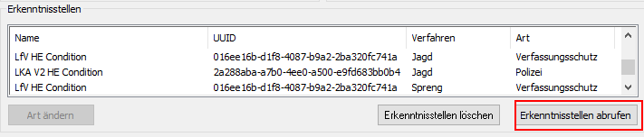 Damit Sie Ihre Regelanfragen sowohl an das LKA, als auch an den Verfassungsschutz richten können, müssen die vom zentralen OSiP-System bereitgestellten Erkenntnisstellen für den Bereich "Jagd" abgerufen und einem Verfahren zugeordnet werden. Klicken Sie hierzu auf den Button [Erkenntnisstellen abrufen].