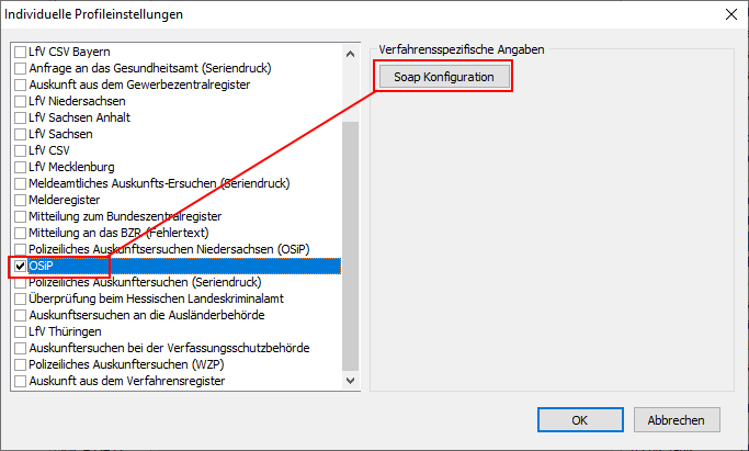 Markieren Sie im Fenster Individuelle Profileinstellungen links den Menüpunkt „OSIP“ und klicken Sie anschließend rechts oben auf [Soap Konfiguration], um die Osip Soap Einstellungen zu öffnen.
