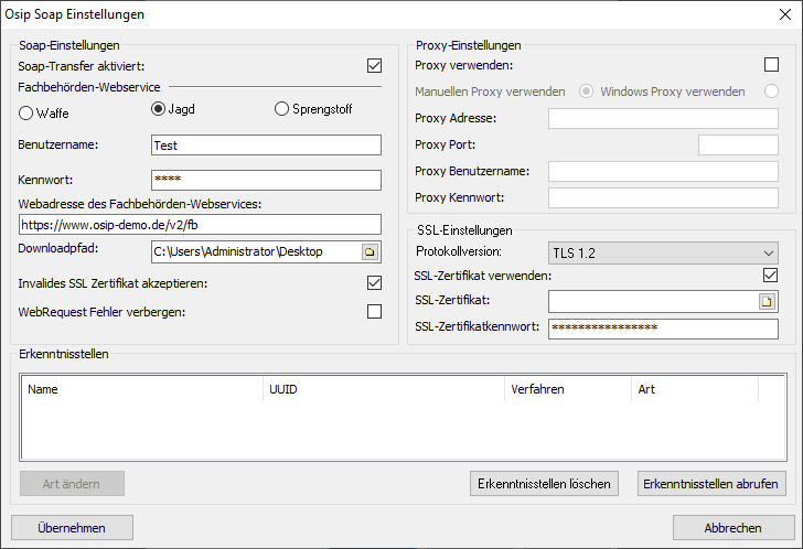 Erfassen Sie anschließend unter Webadresse des Fachbehörden-Webservices die folgende URL: https://osip-kern.bwl.de:8443/osip-core/v2/fb?wsdl