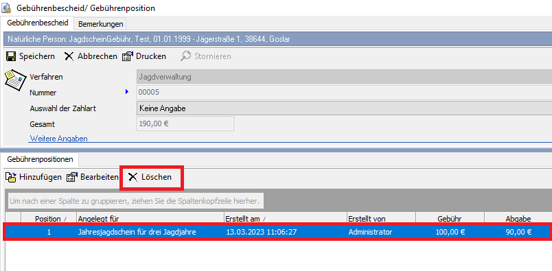 und löschen Sie dort die aktuell hinterlegte Gebührenposition.