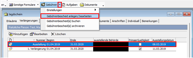 Nun können Sie innerhalb der Jagdscheinmaske die betroffene Ausstellung/ Verlängerung markieren und über das Menü [Gebühren] in der oberen Menüleiste mit Hilfe des Unterpunktes „Gebühren anlegen/ bearbeiten“