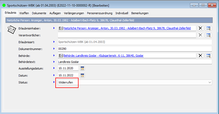 Vor einem Widerruf der waffenrechtlichen Erlaubnis ist der Waffenstatus auf „im Besitz - Inland“ gesetzt, was bedeutet, dass der Erlaubnisinhaber die Waffe legal besitzt. Bei einem Widerruf muss der Waffenstatus angepasst werden: