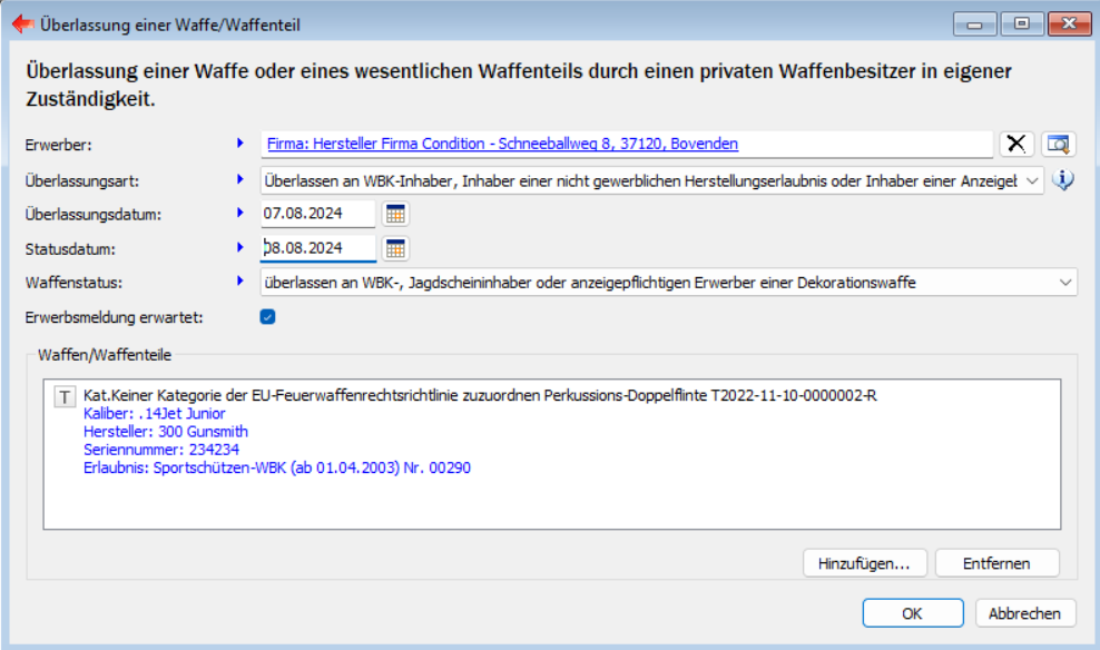 Wenn eine abschließende Regelung zum Verbleib der Waffen getroffen wird, kann der Status weiter geändert werden, beispielsweise auf „überlassen an Händler“ oder „überlassen an WBK-Inhaber“, wenn die Waffen an eine berechtigte Person übergeben werden.