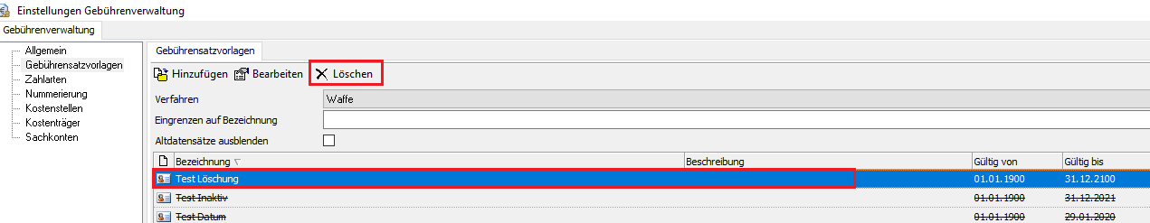 Um eine Gebührensatzvorlage zu löschen, markieren Sie den zu löschenden Datensatz innerhalb der Maske Gebührensatzvorlagen und klicken dann anschließend auf den in der oberen Menüleiste befindlichen Button [Löschen].