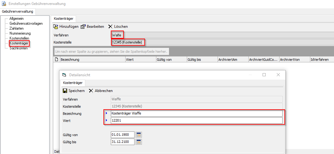 Kostenträger werden einer bestehenden GEB_Kostenstelle zugeordnet. Kostenträger können pro Verfahren (Waffe, Jagd, Spreng) getrennt erfasst werden, da mehrere Kostenträger pro Verfahren notwendig sein können.