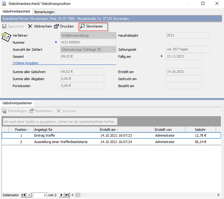 Dazu öffnen Sie den betroffenen Gebührenbescheid und klicken innerhalb der Rechnungsmaske auf die Schaltfläche [Stornieren].