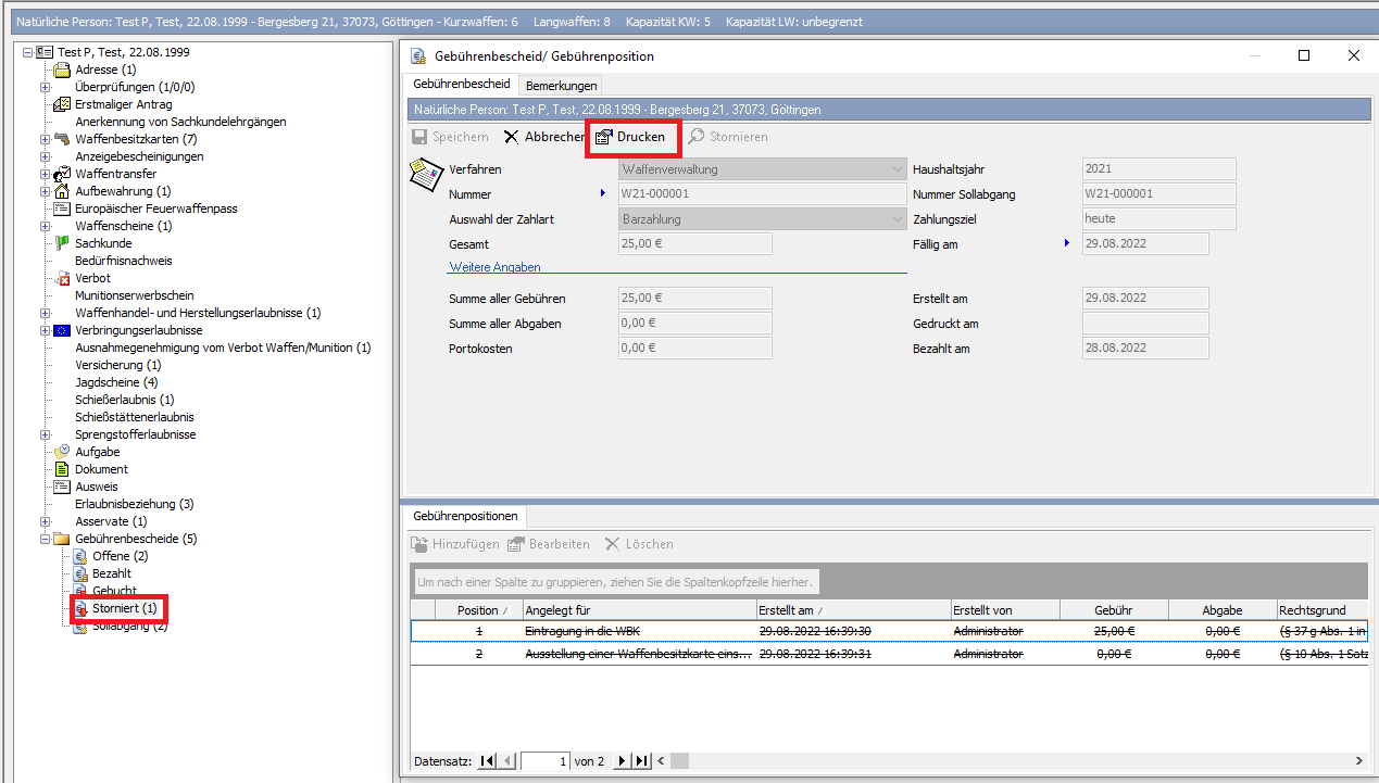 Nachdem der Sie einen Gebührenbescheid storniert haben, kann dieser unter dem Punkt "Storniert"  eingesehen werden.