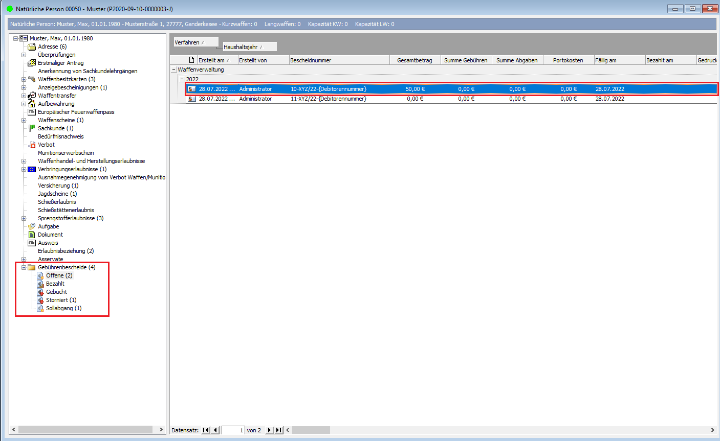 Wählen Sie den Gebührenbescheid aus, welcher die zu löschende Gebührposition(en) enthält und öffnen Sie diesen über den Personennavigator.