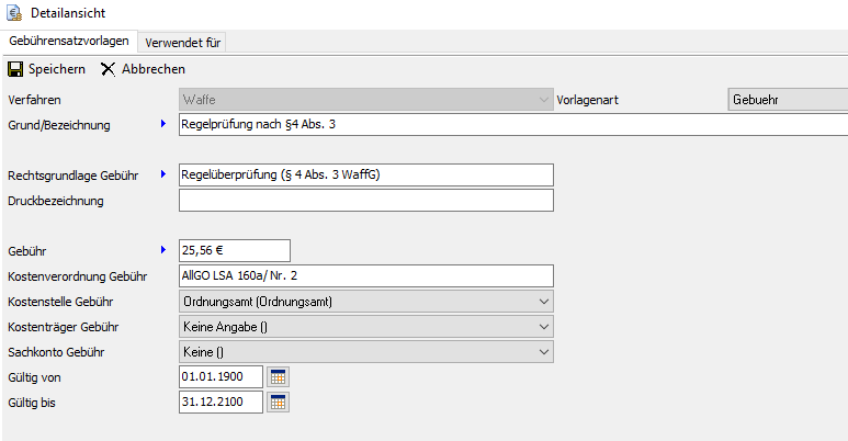 Auf dem Reiter "Gebührensatzvorlagen" hinterlegen Sie die Ihrer Kostenverordnung zu entnehmenden Gebührendaten und tragen diese in die dafür vorgesehenen Felder ein.