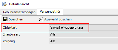 Wechseln Sie dann auf den Reiter "Verwendet für". Hier ist es wichtig, dass Sie die Objektart "Sicherheitsüberprüfung" auswählen. Andernfalls steht der neue Gebührendatensatz nicht in der Registerauskunft zur Auswahl. Klicken Sie abschließend auf die Schaltfläche [Speichern].