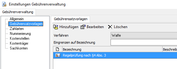 Um aus der Registerauskunft heraus Gebührenbescheide zu erzeugen, ist es notwendig, zuvor in der Waffen- oder Jagdverwaltung in den Einstellungen der Gebührenverwaltung eine entsprechende "Gebührensatzvorlage" anzulegen. Öffnen Sie dazu den besagten Menüpunkt über den Button [Gebühren] aus der oberen Menüleiste heraus. Navigieren Sie dann über "Einstellungen" in die "Gebührensatzvorlagen" und klicken Sie den Punkt mit der linken Maustaste an.