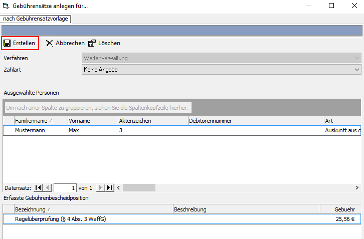 Um eine neue Gebühr im Programm anzulegen, wechseln Sie zunächst in den Ordner "Beantwortete Auskunft". Markieren Sie dann eine oder mehrere Personen in der gruppierten Ansicht "Auskunft aus dem Bundeszentralregister" und klicken Sie anschließend