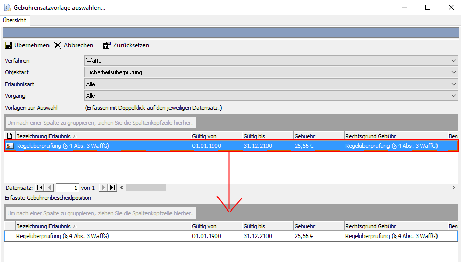 Selektieren Sie den gewünschten Gebührensatz in der oben angeordneten Tabelle und klicken Sie diesen dann mit der linken Maustaste doppelt an. Die Aktion übernimmt den Datensatz in den Bereich "Erfasste Gebührenbescheidposition". Sofern Sie eine fehlerhafte Auswahl getroffen haben, können Sie diese über die gleichnamige Schaltfläche in der Menüleiste der Maske "Gebührensatzvorlagen auswählen" [Zurücksetzen].