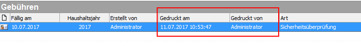 Nach einem erfolgreichem Druck werden in die Felder "Gedruckt am" und "Gedruckt von" Informationen des Druckzeitpunkts sowie des ausführenden Sachbearbeiters geschrieben. Diese Felder unterstützen Sie dabei zu erkennen, welche Personen bereits einen Gebührenbescheid erhalten haben.
