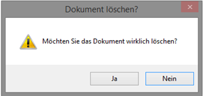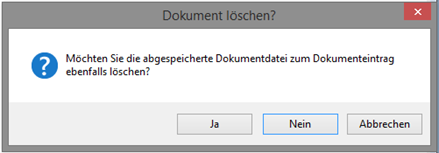Im Anschluss erscheint ein zweites Bestätigungsfenster, welches bei einem Klick auf den Button [Ja] auch die Datei aus dem Ablageordner des DMS entfernt. Alle Elemente werden hierdurch unwiederbringlich gelöscht. Klicken Sie auf die Schaltfläche [Nein], wird die Datei zu Wiederherstellungszwecken in der Dateiablage des Dokumentenmanagementsystems belassen. Wählen Sie [Abbrechen], um die gesamte Löschaktion abzubrechen und alle programminternen Verknüpfungen beizubehalten.
