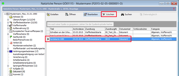 Um ein Dokument aus dem Datenbestand des DMS zu entfernen, markieren Sie den gewünschten Eintrag in der Übersichtstabelle und klicken dann auf die Schaltfläche [Löschen] in der darüber angeordneten Menüleiste.