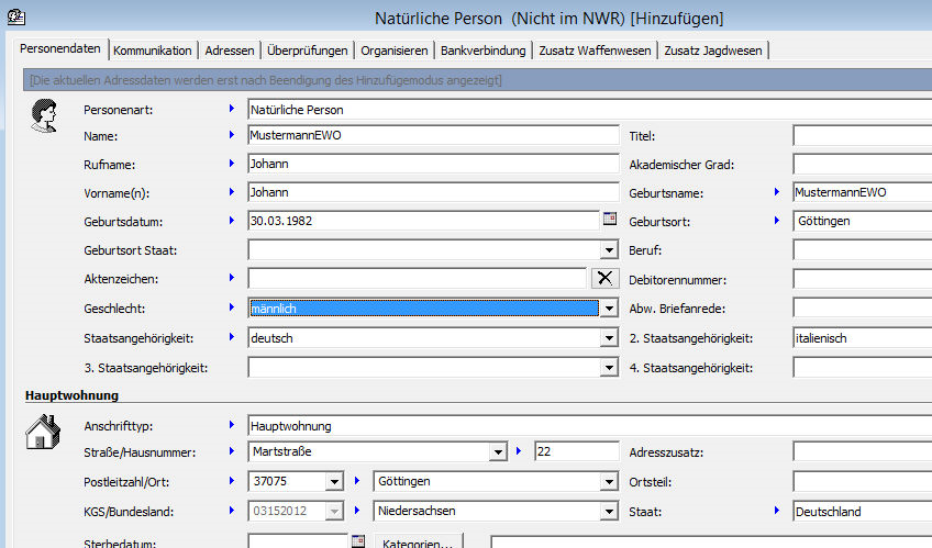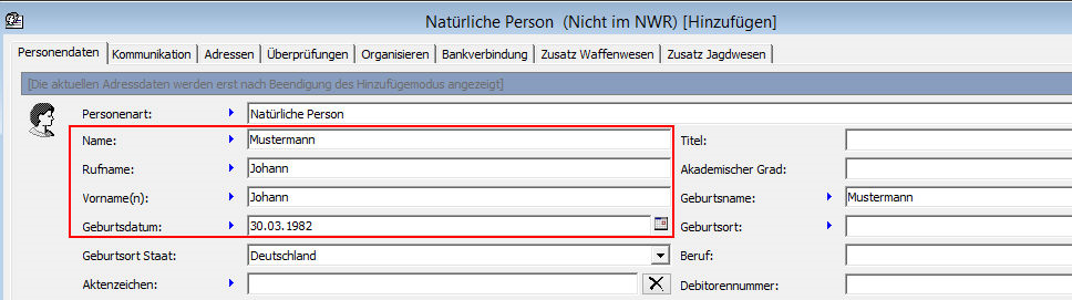 Sobald Sie die Personenmaske in den "Hinzufügemodus" versetzen, dies kann bspw. mit Hilfe des Quickfinders oder das Menü "Datei -> Neu -> Person" geschehen, wird auch die Remoteabfrage von Daten aus dem Einwohnermeldesystem aktiviert. Füllen Sie die Felder "Name", "Rufname" und "Geburtsdatum" mit den Ihnen vorliegenden Personendaten des Antragstellers. Betätigen Sie die Taste [Tab] oder klicken Sie nach der Dateneingabe in ein alternatives Feld innerhalb der Personenmaske.