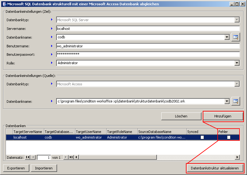 Fügen Sie Ihre Eingaben der Aufgabenliste des Tools „dbsync.exe“ hinzu, indem Sie die gleichnamige Schaltfläche betätigen. Das Programm überprüft bereits vor der Ausführung des eigentlichen Anpassungsprozesses, ob mit den Benutzerdaten eine erfolgreiche Anmeldung am SQL Server durchgeführt werden kann. Achten Sie dabei auf den Bereich „Fehler“. Sofern Sie mit jedem Update mehrere Datenbanken aktualisieren müssen, bspw. im zentralen Betrieb von WorkOffice, kann die Aufgabenliste auch Im- und Exportiert werden. Die beiden Schaltflächen finden Sie im unteren linken Bereich der Maske.