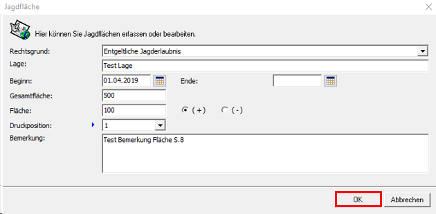 Die Felder gliedern sich in die Punkte „Rechtsgrund“, „Lage“, „Beginn“, „Ende“, „Gesamtfläche“, „Fläche + -“, „Druckposition“ und „Bemerkung“.