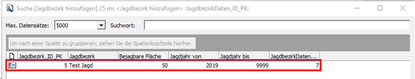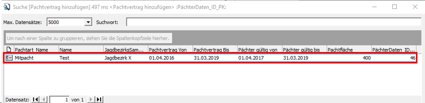 Ist die Person als Pächter in einem oder mehreren Jagdbezirken in Ihrer Zuständigkeit als gültiger Pächter erfasst worden, haben Sie die Möglichkeit, die Bezirksdaten über einen Klick auf den Button [Pachtvertrag] aus den lokalen Pachtdatensätzen auszuwählen und zu übernehmen.