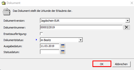 Um ein neues Dokument hinzuzufügen, aktivieren Sie bitte den Reiter „Dokumente“ auf der Jagdscheinerlaubnis. Klicken Sie in diesem Fenster auf den Punkt [Hinzufügen]. Bitte beachten Sie, dass das alte Dokument nicht den Status „im Besitz“ aufweisen darf, wenn ein neues Dokument hinzugefügt werden soll. Wie der Status eines Dokumentes geändert wird, erfahren Sie im Punkt „Dokumente bearbeiten“.