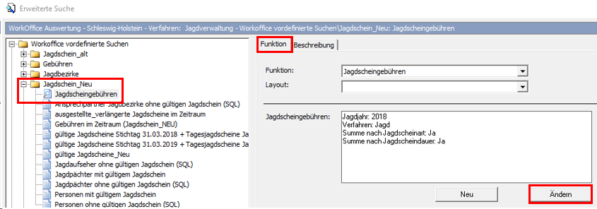 Klicken Sie in der Baumstruktur der erweiterten Suche auf den Punkt „Jagdscheingebühren“ und wählen Sie den Reiter [Funktion] aus. Mit einem Klick auf den Button [Ändern] können die Suchkriterien definiert werden.
