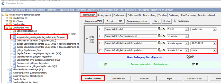 Klicken Sie in der Baumstruktur der erweiterten Suche auf den Punkt „Ausgestellte_verlängerte Jagdscheine im Zeitraum“ und wählen Sie hier den Reiter [Bedingungen]. Die Suchkriterien werden direkt im rechten Bereich des Fensters definiert.