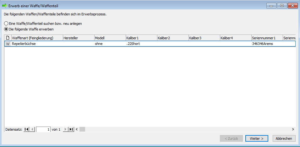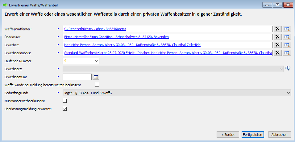 - Es erfolgt eine automatische Übernahme der Waffendaten in die Waffenerwerbsmaske.