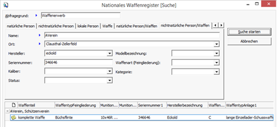 Verwenden Sie das Suchprofil "nichtnatürliche Person/Waffe", um mit Hilfe der NWR Suche eine oder mehrere Waffen aufzufinden, welche sich im Besitz von einer eindeutig definierten Firma oder eines Vereins befinden. Diese Suche kann bspw. bei einem Waffenbesitzwechsel (Waffeneintragungen) aus der Maske der Waffenbesitzkarte heraus angewendet werden.