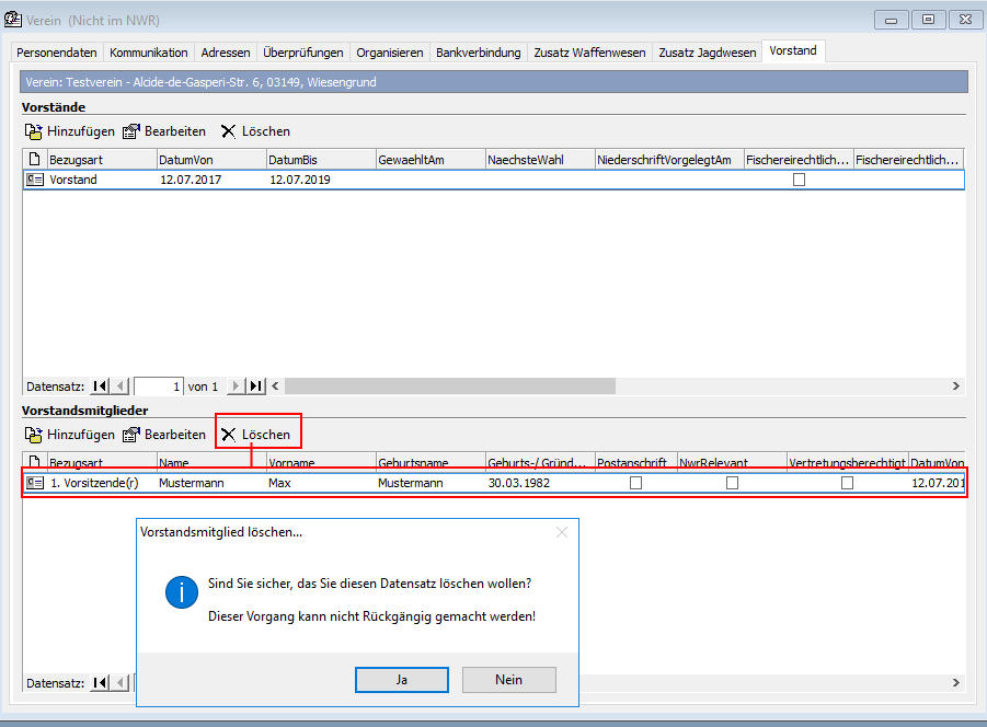 Um die Verknüpfung der Person endgültig aus dem Datenbestand zu entfernen, bestätigen Sie den folgenden Löschhinweis über die Schaltfläche [Ja]. Um zur Karteikarte "Vorstand" zurückzukehren und die Löschaktion zu verwerfen, Klicken Sie auf [Nein].