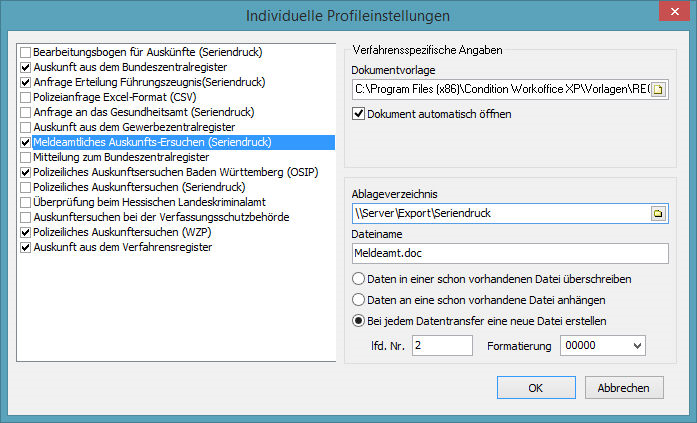 Das Ablageverzeichnis sollte für jedes Seriendruck-Ausgabeprofil individuell eingestellt werden und von dem voreingestellten Exportpfad für elektronische Auskunftsersuchen, welchen Sie bereits über den Punkt "Datentransfer" definiert haben, abweichen.
