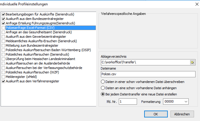 Über die Auswahlfelder "Daten in einer schon vorhandenen Datei überschreiben" bzw. "..anhängen", können Sie bestimmen, wie die Registerauskunft sich bei der Ausgabe neuer Regelüberprüfungen verhalten soll. Alternativ können Sie eine Datei mit einer bei jeder Anfrage eindeutigen Zeichenfolge erstellen.