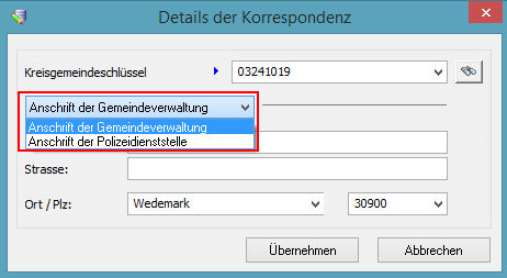 Für jeden Kreisgemeindeschlüssel kann jeweils eine zuständige Gemeinde, sowie eine Polizeidienststelle hinterlegt werden. Anhand der unter dem Feld "Kreisgemeindeschlüssel" angeordneten Auswahlbox können Sie bestimmen, welche Adressart Sie in der Registerauskunft erfassen möchten. Empfehlenswert ist es immer beide Adressarten zu erfassen.