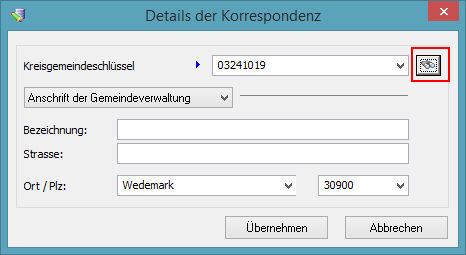 Betätigen Sie anschließend das ebenfalls rechts angeordnete Fernglas, um im unteren Bereich der Maske die Postleitzahl und den Ort der zuständigen Stelle vom Programm ausfüllen zu lassen.
