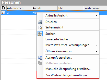Auch aus der Registerauskunft können eine oder mehrere Personen zur Warteschlange hinzugefügt werden. Dies ist besonders dann empfehlenswert, wenn Sie die in den "offenen Auskünften" befindlichen Einträge, zu denen keine Antwort durch das Register erfolgt ist, erneut prüfen möchten. Merken Sie alle Personen vor dem Löschen aus den "offenen Auskünften" vor, um eine exakte Liste der zu wiederholenden Arbeitsschritte abzubilden. Eine Ergänzung der Warteschlangenliste ohne den zuvor erläuterten Sachverhalt ist selbstverständlich auch möglich.
