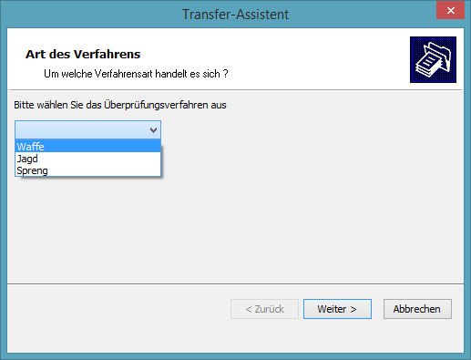 Im ersten Schritt des Transferassistenten wählen Sie das "Überprüfungsverfahren" aus, mit dessen Hilfe die Überprüfungen nicht nur in der Registerauskunft kategorisiert, sonder darüber hinaus auch nur von Sachbearbeitern mit bestimmten Rechten abgerufen werden können.