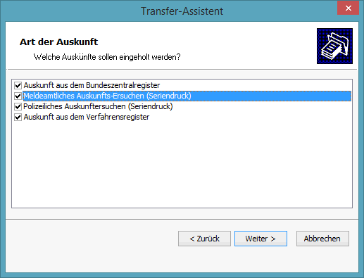 Im nächsten Schritt selektieren Sie die gewünschte Art der Überprüfung. Dies kann nur eine „Auskunft aus dem Bundeszentralregister“ sein, möglich ist aber auch eine kombinierte Abfrage aus mehreren elektronischen Abfragearten inkl. aller Seriendruckprofile. Setzen Sie dazu bei allen gewünschten Auskunftsarten einen Haken. Bei der Abfrage von zwei oder mehr Registern wird für jede Anfrageart eine eigene Datei erzeugt und, je nach zuvor eingestellten Datenübertragungswegen, automatisch an das entsprechende Register übertragen. Darüber hinaus werden die Datumsfelder für die letzte Überprüfung in der WorkOffice-Datenbank auf das „heutige“ Datum gesetzt.