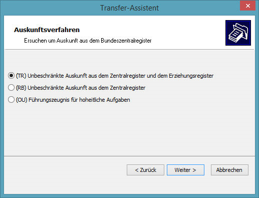 Das Fenster „Auskunftsverfahren“ erscheint nur, wenn sie im vorhergehenden Schritt des Assistenten die Ausgabeart „Auskunft aus dem Bundeszentralregister“ selektiert haben. Wählen sie hier zwischen dem Code