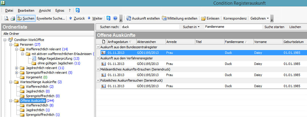 Nach Abschluss eines Anfragevorgangs über den Überprüfungs-Assistenten oder die Warteschlange, werden alle bei dieser Aktion überprüften Personen mit dem Status „Offen“, d.h. zu den Anfragen steht eine Antwort durch das Register noch aus, in die Liste „Offene Auskünfte“ eingetragen. Die Anfragen sind dabei in die Kategorien "Waffen-, Jagd- und sprengstoffrechtlich" unterteilt. Der Verwendungszweck der Auskunft, z.B. W11 sowie das Datum der Anfrage kann jederzeit in den offenen Auskünften eingesehen werden. Sobald eine passende Rücklaufdatei vom Register in das Programm eingelesen wurde, ändert sich der Status der Anfrage von „offen“ in „beantwortet“ und wird fortan in der Liste „Beantwortete Auskünfte“ aufgelistet.