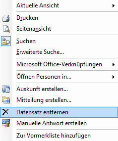 Wenn sie eine Person, zu der bereits ein offenes Auskunftsersuchen an das Register besteht, erneut überprüfen möchten, müssen sie zuerst den Datensatz aus der Liste „Offene Auskünfte“ entfernen. Verwenden sie die Tastenkombination „[Strg] + [A]“ um alle Datensätze in der Liste zu markieren. Sie können aber auch nur einen oder einige ausgewählte Personendatensätze markieren. Hierzu halten sie die Taste [Strg] gedrückt und markieren die gewünschten Datensätze mit der linken Maustaste. Über die Taste [Entf] oder über die rechte Maustaste -> „Datensatz entfernen“ können sie die markierten Einträge löschen (Dieser Vorgang ist nicht rückgängig zu machen).