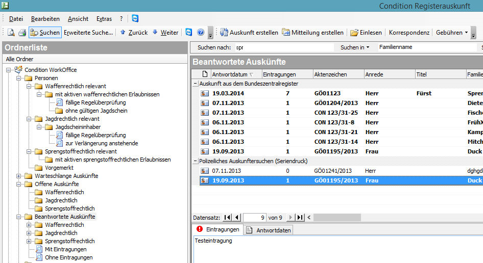 Nach dem Einlesen von Rücklaufdaten werden Anfragedatensätze aus der Maske „Offene Auskünfte“ um Antwortdaten ergänzt und in den Ordner „Beantwortete Auskünfte“ verschoben. Die Beantworteten Auskünfte gliedern sich in einen Tabellenteil und einen Vorschauteil. Im Tabellenteil werden die Daten gruppiert nach der Art der Überprüfung, z.B. „Auskunft aus dem Bundeszentralregister“ aufgelistet. Das Datum der Auskunft sowie die Anzahl der Eintragungen sind sofort ersichtlich. Personen mit Eintragungen im Register werden in Fettschrift dargestellt. Die „Beantworteten Auskünfte“ sind, wie auch der Ordner „Personen“ und „Offene Auskünfte“ durch vordefinierte Suchordner unterteilt. Die Untergliederung der Daten erfolgt nach Personen mit und ohne Eintragungen sowie einem Ordner für fehlerhafte Rücklaufdaten.