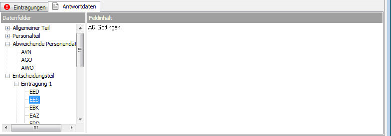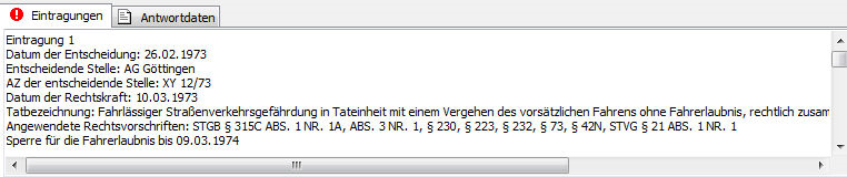 Die Karteikarte „Antwortdaten“ basiert auf den Datensatzbeschreibungen der beauskunftenden Stellen und kann zur genauen Datensatz- und Fehleranalyse eingesetzt werden. Jeder Antwortdatensatz wird hier in seine einzelnen Datenfelder aufgegliedert dargestellt. Im Regelfall müssen sie diese Karteikarte nicht verwenden, da die Registerauskunft alle Daten für Sie in übersichtlicher Form darstellt.