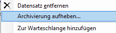 Wenn sich die Person bereits in den "Archivierten Auskünften" befinden, klicken Sie den Datensatz bitte mit der rechten Maustaste an und wählen Sie aus dem Untermenü "Archivierung aufheben". Anschließend kann die Löschmeldung, wie im folgenden Abschnitt beschrieben, aus den "beantworteten Auskünften" erfolgen.