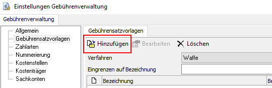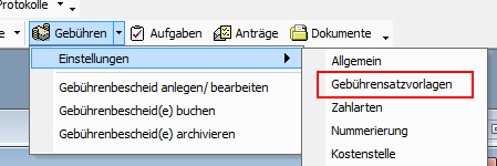 Um aus der Registerauskunft heraus Gebührenbescheide zu erzeugen, ist es notwendig, zuvor in der Waffen- oder Jagdverwaltung in den Einstellungen der Gebührenverwaltung eine entsprechende "Gebührensatzvorlage" anzulegen. Öffnen Sie dazu den besagten Menüpunkt über den Button [Gebühren] aus der oberen Menüleiste heraus. Navigieren Sie dann über "Einstellungen" in die "Gebührensatzvorlagen" und klicken Sie den Punkt mit der linken Maustaste an.