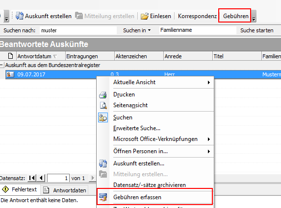 Eine Gebühr kann aus der Registerauskunft heraus ausschließlich für beantwortete Datensätze mit der Auskunftsart "Auskunft aus dem Bundeszentralregister" erzeugt werden.