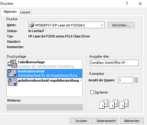 Selektieren Sie im nachfolgenden Fenster die von Ihnen gewünschte Vorlage zum Drucken des Gebührenbescheides aus der Liste "Druckvorlage" aus. Klicken Sie anschließend auf [Drucken] um den Druck sofort zu starten oder wählen Sie [Seitenansicht] um das zu erstellende Serienanschreiben vor dem Drucken einzusehen.