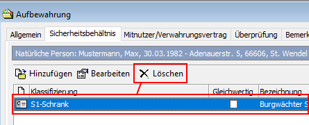 Zum Bearbeiten eines Sicherheitsbehältnisses, markieren Sie den Tabelleneintrag und klicken anschließend auf den Button [Löschen]. Der Vorgang kann nicht rückgängig gemacht werden.