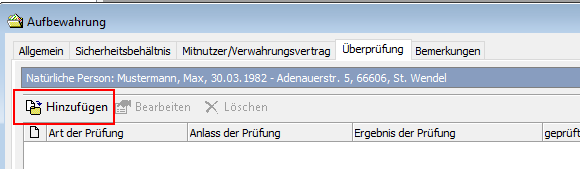 Um eine Überprüfung hinzuzufügen, klicken Sie bitte innerhalb der Aufbewahrungsmaske auf den Reiter „Überprüfung“ und anschließend auf den Button [Hinzufügen].