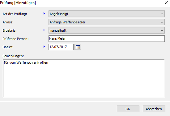 Es öffnet sich das Fenster „Prüfung“. Geben Sie die "Art der Prüfung" an. Hier stehen Ihnen die Werte "Angekündigt" und "unangekündigt" zur Verfügung. Unter "Anlass" hinterlegen Sie den Grund der Überprüfung des Aufbewahrungsortes sowie das "Ergebnis" der Prüfung. Die "Prüfende Person" kann optional angegeben werden. Tragen Sie das "Datum" der Überprüfung in das dafür vorgesehene Feld ein und verwenden Sie die "Bemerkungen" um z.B. festgestelle Mängel während der Überprüfung zum Vorgang zu erfassen.