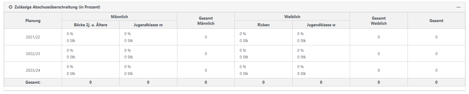 In der Tabelle "Zulässige Abschussüberschreitung" können Sie die zulässige Abschussüberschreitung (in %) eintragen. Die Zahl der Stücke wird Ihnen automatisch vom Programm ausgerechnet.